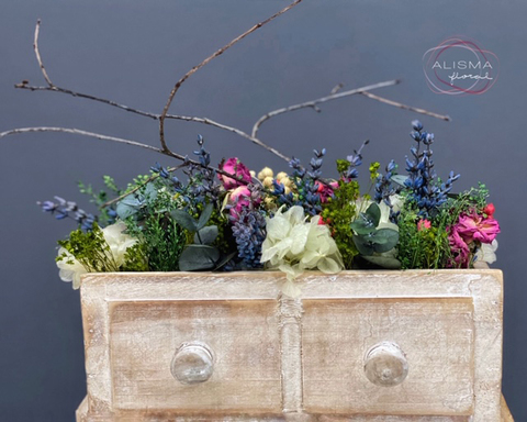 Un original centro de flores preservadas en una base de madera con forma de cajón perfecto para regalar.
