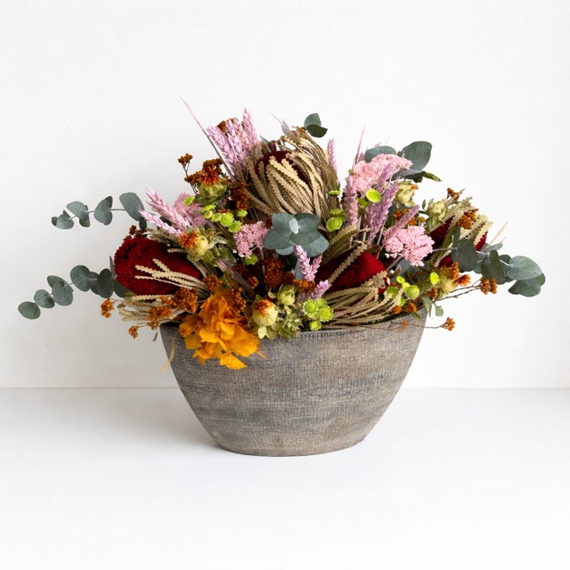 Sorprende con un regalo diferente, elegante y lleno de personalidad. Este centro de flores secas y preservadas en tonos naturales, granates y rosados está diseñado para emocionar y acompañar durante mucho tiempo sin necesidad de cuidados.