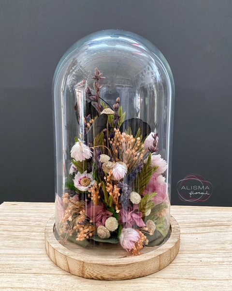 Un centro muy alegre de flores preservadas un una novedosa cúpula de cristal, perfecto para regalar.