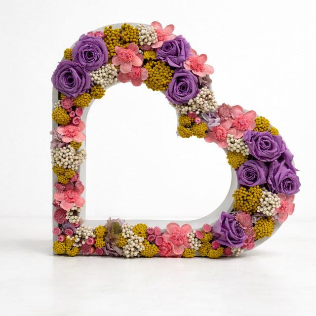 Este corazón floral decorativo está elaborado artesanalmente con flores preservadas y secas, creando una composición romántica, elegante y duradera. Es el regalo perfecto para sorprender en San Valentín, aniversarios, cumpleaños, día de la Madre o como pieza decorativa para el hogar.