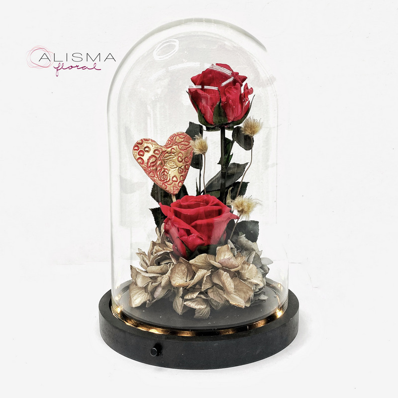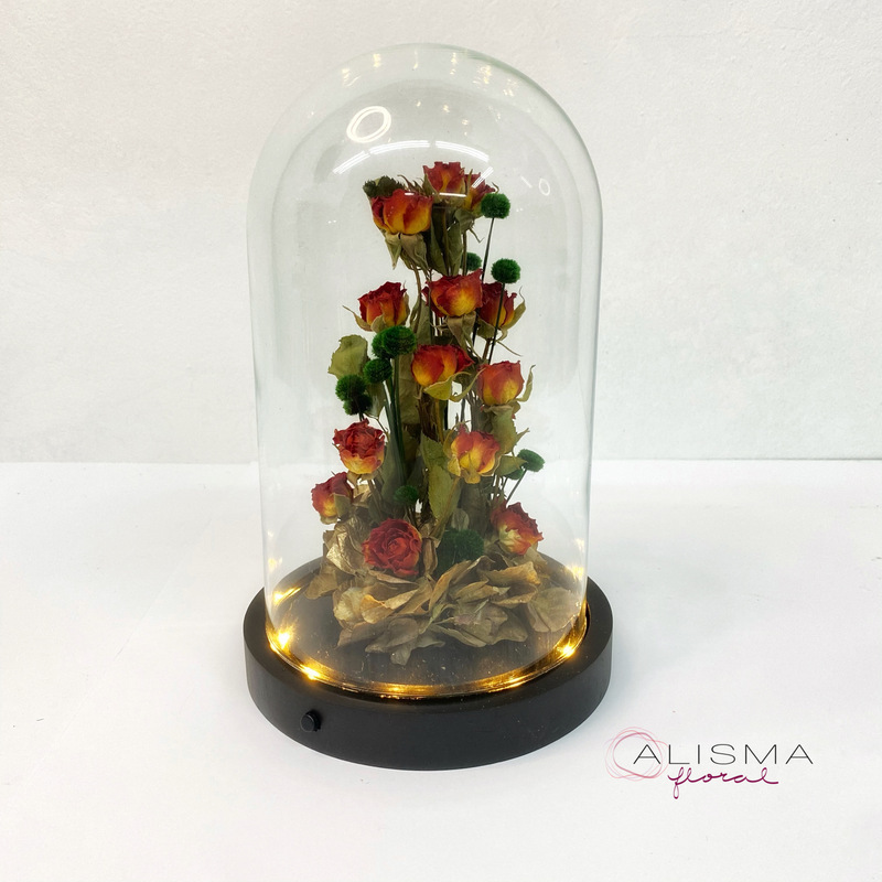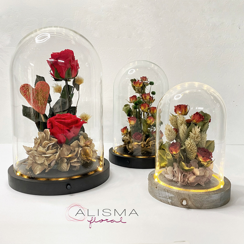 Un regalo diferente para sorprender cúpula de cristal con flores preservadas y secas.