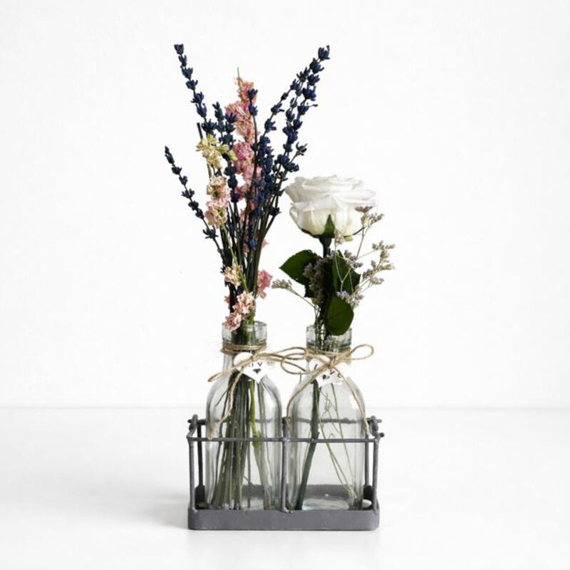 Cada arreglo se presenta en botellas de cristal con soporte metálico, creando una pieza decorativa armoniosa, limpia y moderna, ideal para hogares, oficinas, regalos de cumpleaños, aniversarios o detalles especiales.
