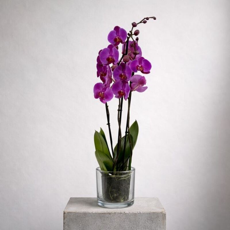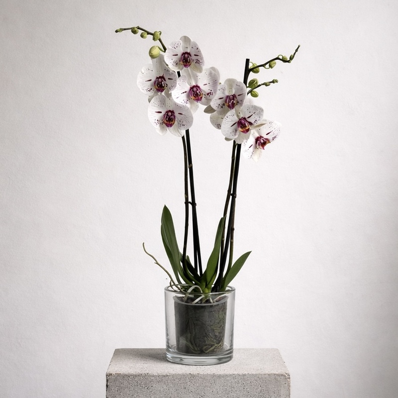 Tosas nuestras orquídeas se presentan cuidadosamente para regalo, tanto en versión con macetero como sin macetero. La imagen del producto muestra la orquídea con macetero decorativo de cristal. OPCIONES DE COMPRA