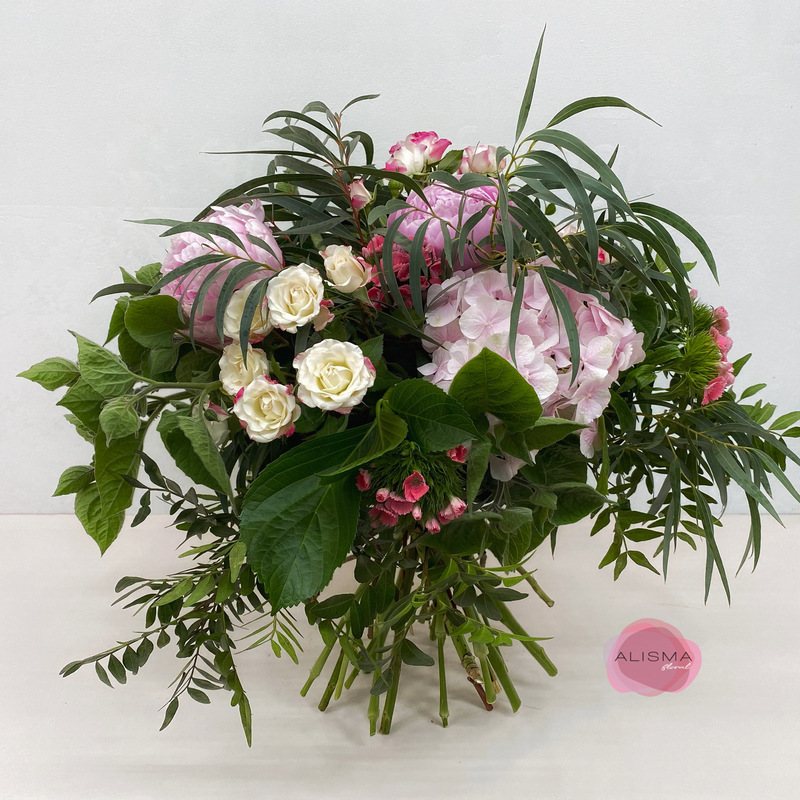 Regala este ramo lleno de delicadeza, peonias, rosas, hortensia y verdes, una mezcla de elegancia, belleza, aromas y frescura de flores y verdes silvestres de temporada, un ramo perfecto para regalar en cumpleaños, aniversarios, pedidas de mamo, declaración de amor por ser las peonias son una de las favoritas de las novias