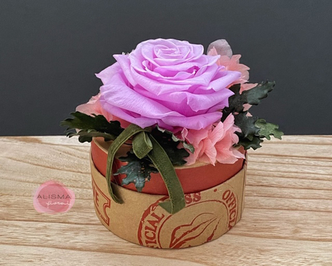 Regala una rosa preservada Color Lavanda decorada con Hortensia