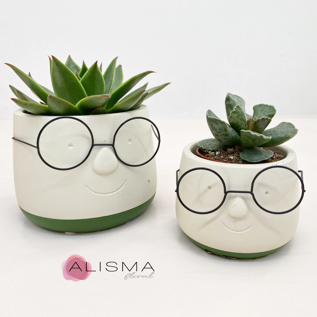 Juego de plantas suculentas en maceteros Manolos con Gafas, incluye las plantas Echeveria Miranda de 8,5 cm y Adromischus Cooperi de 5,5 cm con los maceteros. 35 €