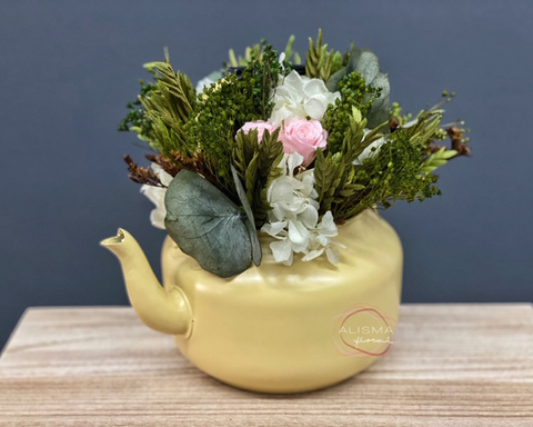 Un maravilloso centro de colores muy vivos en una base de tetera lavanda, perfecto para regalar.